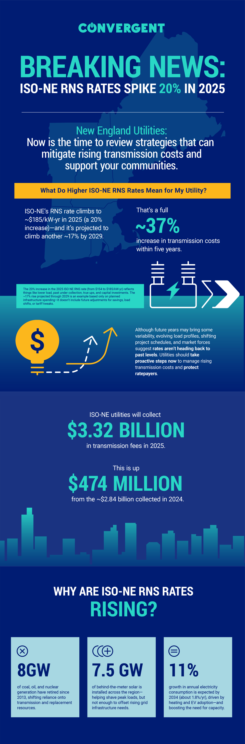 Jul 2, 2025 2:45:51 PM BREAKING NEWS: ISO-NE RNS Rates Spike 20% Convergent Energy and Power Share: facebook-f icon linkedin-in icon Twitter icon envelope icon SOURCES: https://www.iso-ne.com/static-assets/documents/100014/a05.1_2024_08_1314_tc_rns_rates_presentation.pdf https://www.iso-ne.com/about/government-industry-affairs/new-england-state-profiles https://www.iso-ne.com/about/key-stats/resource-mix https://www.utilitydive.com/news/iso-new-england-prepares-11-percent-rise-annual-electricity-consumption/747422/ utilities, battery storage, infograph, geomarket