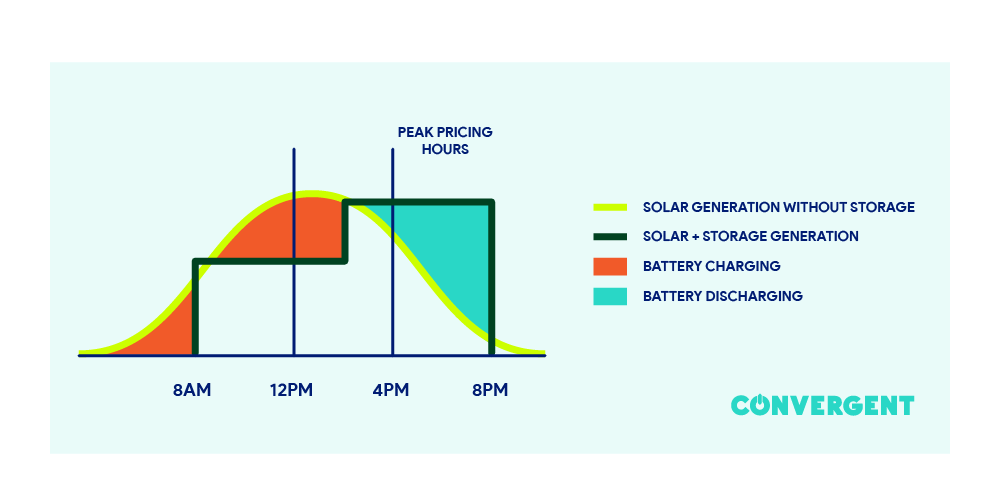 In the graph above, an industrial customer with higher electricity costs between 4:00 p.m. and 9:00 p.m. uses solar power to charge a battery storage system from 7:00 a.m. until noon. Later in the day, this same facility uses that stored power to extend use of its solar generation into those high-priced hours, thereby lowering power costs overall, as shown by the blue shape in the top right quadrant of the graphic.