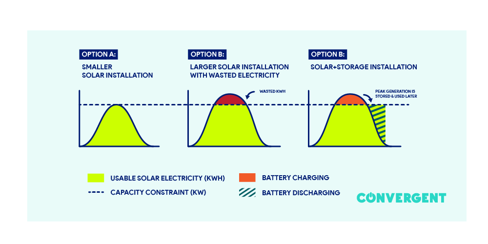 With storage, you can bank additional generation that would exceed your constraint, giving you the chance to install a bigger solar array and gain more value from your solar investment.