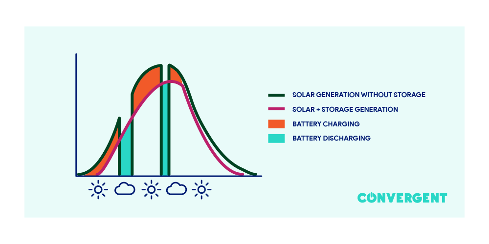 A combined solar and storage installation can adjust for any dips in generation that weather creates. The process of managing those small deviations in generation capacity that passing clouds create is called “solar smoothing.”